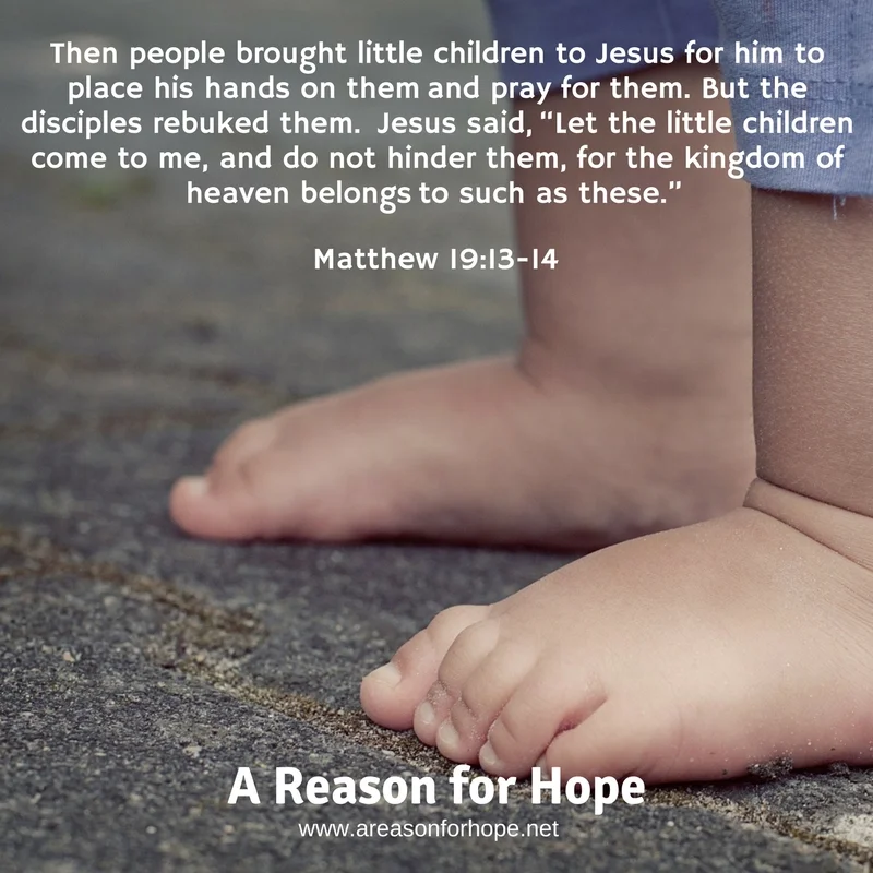 Then people brought little children to Jesus for him to place his hands on them and pray for them. But the disciples rebuked them. Jesus said, “Let the little children come to me, and do not hinder them, for the kingdom of heaven belongs to such as these.” – Matthew 19:13-14