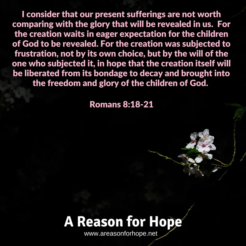 I consider that our present sufferings are not worth comparing with the glory that will be revealed in us. For the creation waits in eager expectation for the children of God to be revealed. For the creation was subjected to frustration, not by its own choice, but by the will of the one who subjected it, in hope that the creation itself will be liberated from its bondage to decay and brought into the freedom and glory of the children of God. – Romans 8:18-21