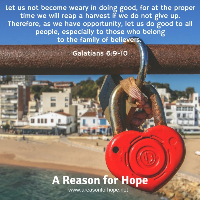 Let us not become weary in doing good, for at the proper time we will reap a harvest if we do not give up. Therefore, as we have opportunity, let us do good to all people, especially to those who belong to the family of believers. – Galatians 6:9-10