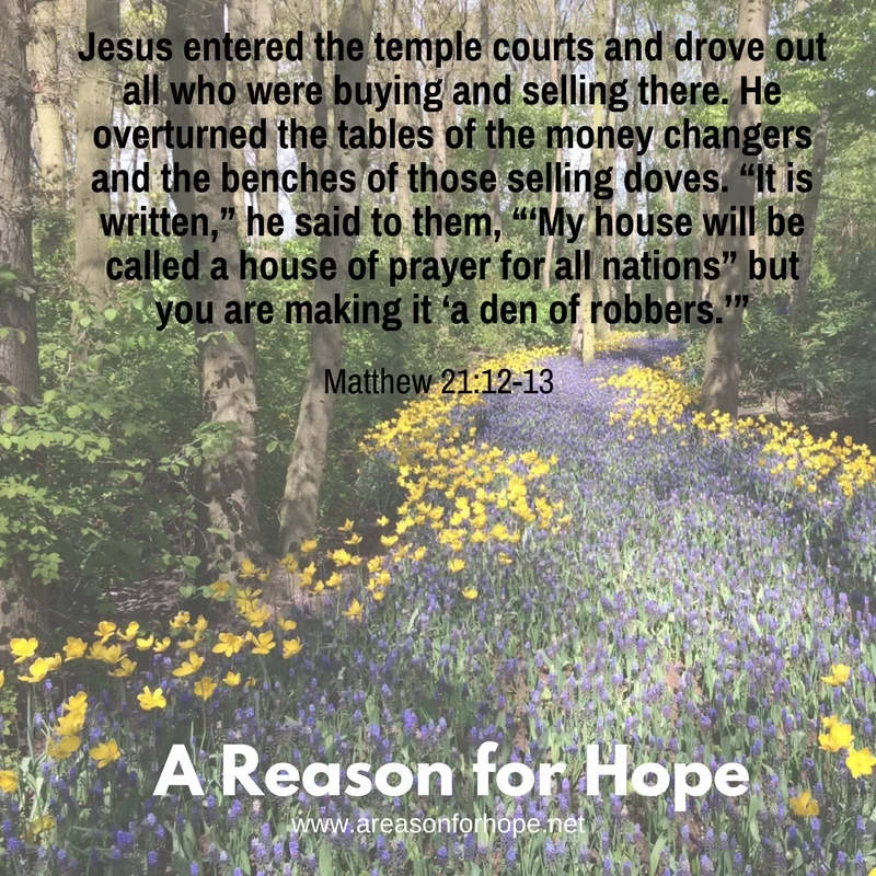 Jesus entered the temple courts and drove out all who were buying and selling there. He overturned the tables of the money changers and the benches of those selling doves. “It is written,” he said to them, “‘My house will be called a house of prayer for all nations” but you are making it ‘a den of robbers.’” – Matthew 21:12-13