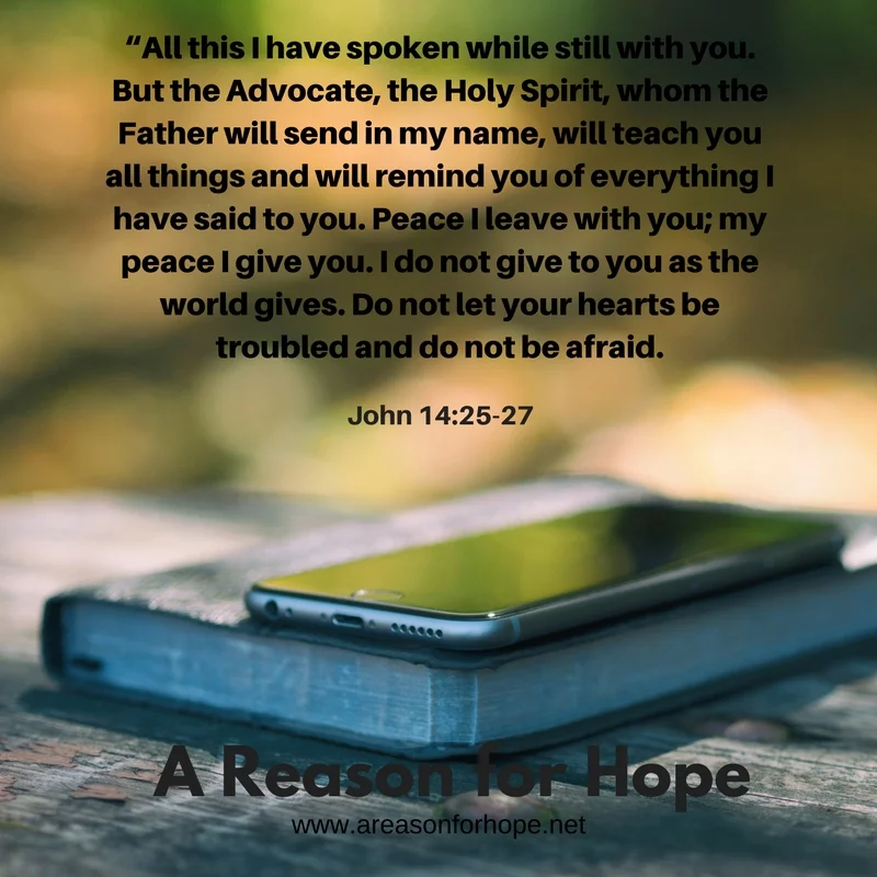 “All this I have spoken while still with you. But the Advocate, the Holy Spirit, whom the Father will send in my name, will teach you all things and will remind you of everything I have said to you. Peace I leave with you; my peace I give you. I do not give to you as the world gives. Do not let your hearts be troubled and do not be afraid. – John 14:25-27