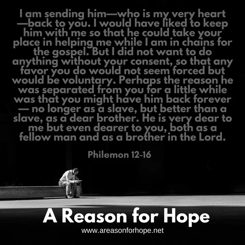 I am sending him—who is my very heart—back to you. I would have liked to keep him with me so that he could take your place in helping me while I am in chains for the gospel. But I did not want to do anything without your consent, so that any favor you do would not seem forced but would be voluntary. Perhaps the reason he was separated from you for a little while was that you might have him back forever— no longer as a slave, but better than a slave, as a dear brother. He is very dear to me but even dearer to you, both as a fellow man and as a brother in the Lord. – Philemon 12-16