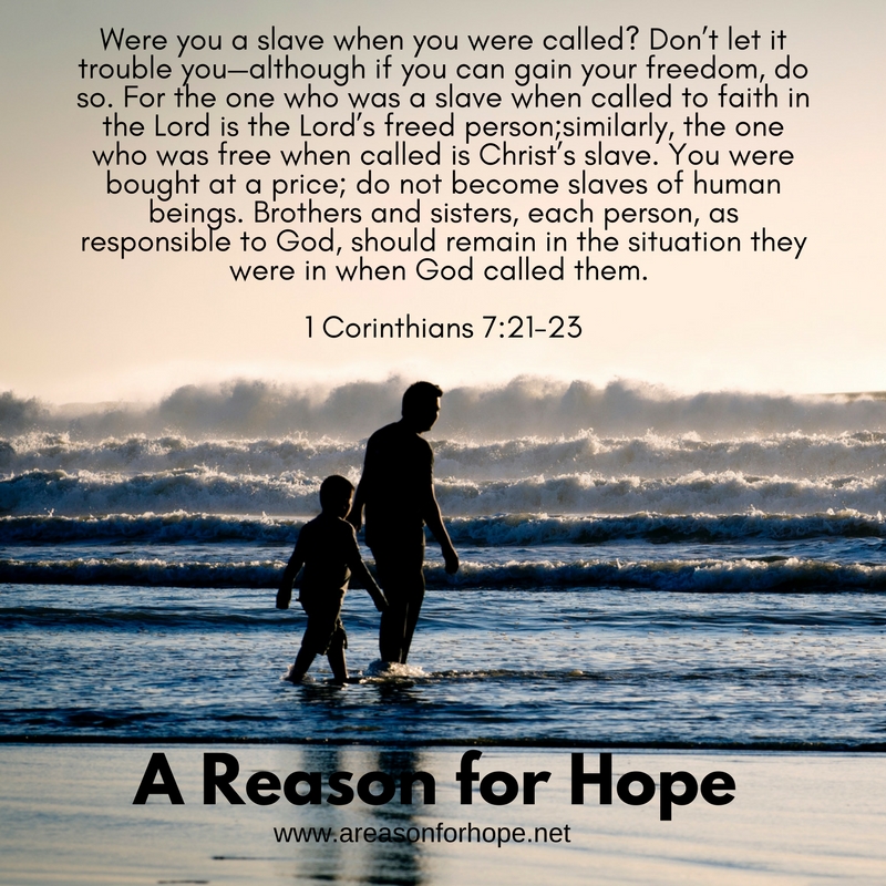 Were you a slave when you were called? Don’t let it trouble you—although if you can gain your freedom, do so. For the one who was a slave when called to faith in the Lord is the Lord’s freed person;similarly, the one who was free when called is Christ’s slave. You were bought at a price; do not become slaves of human beings. Brothers and sisters, each person, as responsible to God, should remain in the situation they were in when God called them. - 1 Corinthians 7:21-23