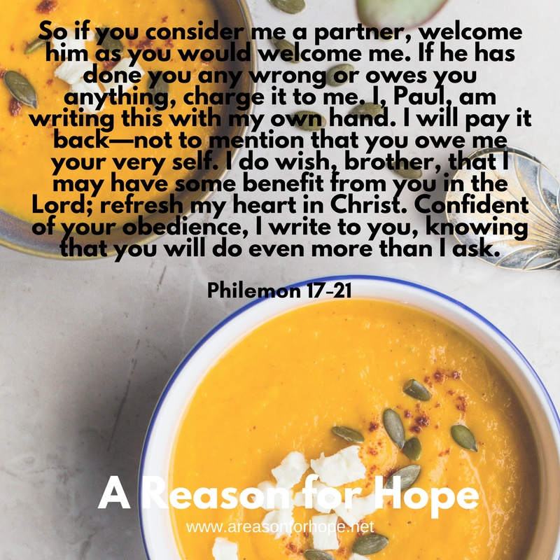 So if you consider me a partner, welcome him as you would welcome me. If he has done you any wrong or owes you anything, charge it to me. I, Paul, am writing this with my own hand. I will pay it back—not to mention that you owe me your very self. I do wish, brother, that I may have some benefit from you in the Lord; refresh my heart in Christ. Confident of your obedience, I write to you, knowing that you will do even more than I ask. – Philemon 17-21