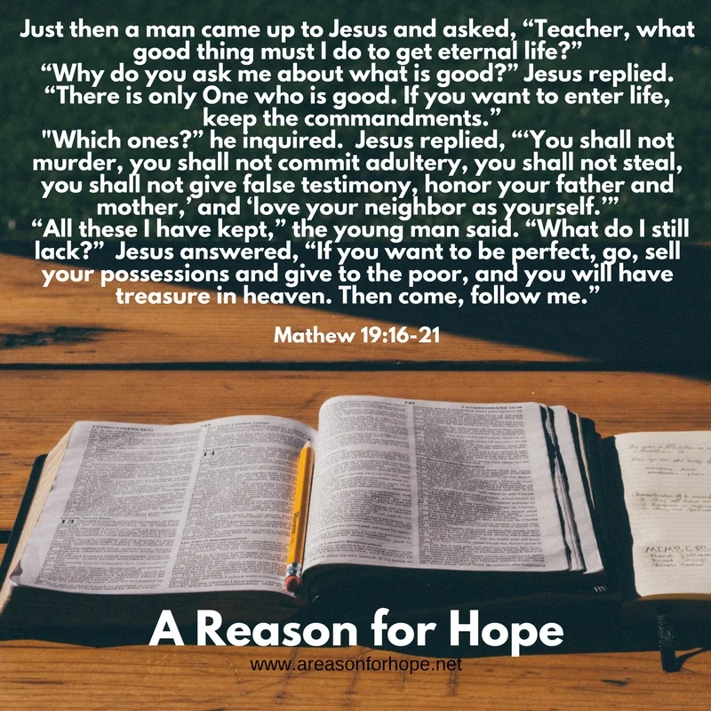 “All these I have kept,” the young man said. “What do I still lack?” Jesus answered, “If you want to be perfect, go, sell your possessions and give to the poor, and you will have treasure in heaven. Then come, follow me.” - Mathew 19:16-21