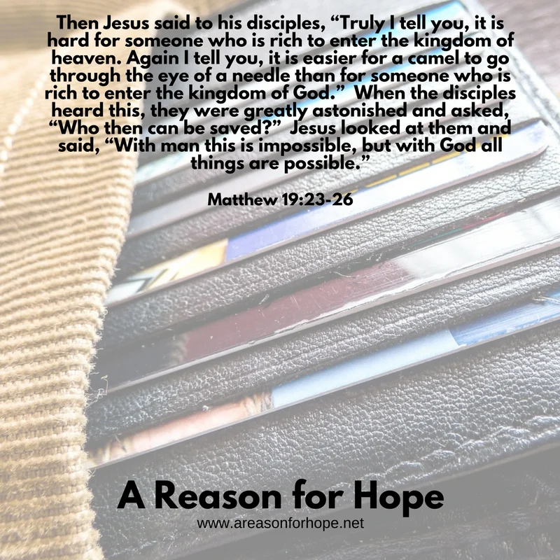Then Jesus said to his disciples, “Truly I tell you, it is hard for someone who is rich to enter the kingdom of heaven. Again I tell you, it is easier for a camel to go through the eye of a needle than for someone who is rich to enter the kingdom of God.” When the disciples heard this, they were greatly astonished and asked, “Who then can be saved?” Jesus looked at them and said, “With man this is impossible, but with God all things are possible.” – Matthew 19:23-26