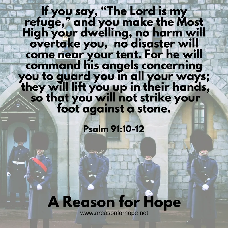 If you say, “The Lord is my refuge,” and you make the Most High your dwelling, no harm will overtake you, no disaster will come near your tent. For he will command his angels concerning you to guard you in all your ways; they will lift you up in their hands, so that you will not strike your foot against a stone. - Psalm 91:10-12