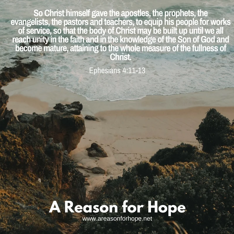So Christ himself gave the apostles, the prophets, the evangelists, the pastors and teachers, to equip his people for works of service, so that the body of Christ may be built up until we all reach unity in the faith and in the knowledge of the Son of God and become mature, attaining to the whole measure of the fullness of Christ. – Ephesians 4:11-13