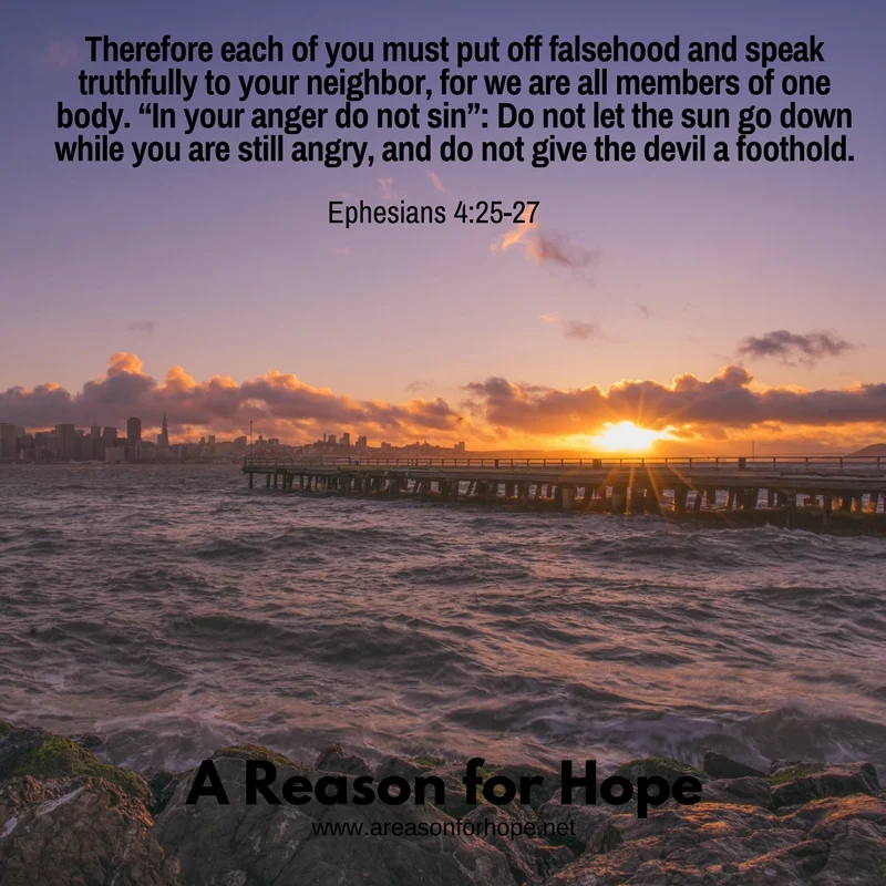 Therefore each of you must put off falsehood and speak truthfully to your neighbor, for we are all members of one body. “In your anger do not sin”: Do not let the sun go down while you are still angry, and do not give the devil a foothold– Ephesians 4:25-27