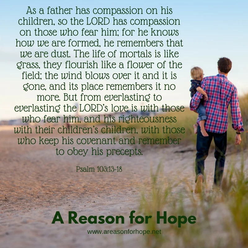 As a father has compassion on his children, so the Lord has compassion on those who fear him; for he knows how we are formed, he remembers that we are dust. The life of mortals is like grass, they flourish like a flower of the field; the wind blows over it and it is gone, and its place remembers it no more. But from everlasting to everlasting the Lord’s love is with those who fear him, and his righteousness with their children’s children, with those who keep his covenant and remember to obey his precepts. – Psalm 103:13-18