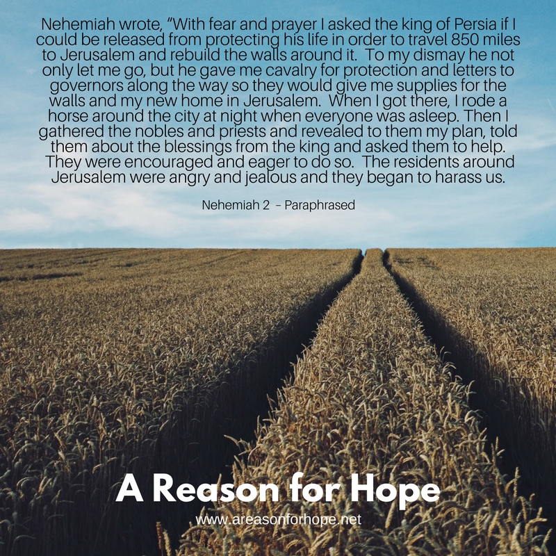 Nehemiah wrote, “With fear and prayer I asked the king of Persia if I could be released from protecting his life in order to travel 850 miles to Jerusalem and rebuild the walls around it. To my dismay he not only let me go, but he gave me cavalry for protection and letters to governors along the way so they would give me supplies for the walls and my new home in Jerusalem. When I got there, I rode a horse around the city at night when everyone was asleep. Then I gathered the nobles and priests and revealed to them my plan, told them about the blessings from the king and asked them to help. They were encouraged and eager to do so. The residents around Jerusalem were angry and jealous and they began to harass us. – Nehemiah 2 – Paraphrased.